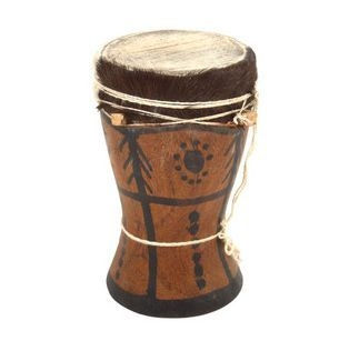 Talking Drum. A traditional musical instrument found in Africa. Even today, the variable sound made by striking the talking drum can be heard throughout rural areas. The talking drum is normally held underneath the arm and struck with a small curved stick. The strings around the drum pull the hide tighter, so the more you squeeze, the higher the pitch. The drum surface is made of animal hide, while the chords are strung with rope, and the base is of hand-carved wood. 9-10" tall 4-5" diameter Traditionally most popular with African hunting to chase animals from the bush. Made in Mali.