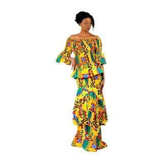 Dress to impress with this luxurious Kente Print Elastic 2-Piece Skirt Set. This regal skirt set has an off-shoulder peplum top with flared short sleeves, an elastic bodice, and a mermaid-style skirt. Great for special events, this vivid set is perfect for the fashionista who loves African print and wants to stand out in the crowd. It's comfortable, bold, and perfect for showcasing African fashion at a formal affair. Celebrate special occasions in dramatic African style with this elastic Kente print skirt set. 100% cotton. Made in Ghana. C-WK422